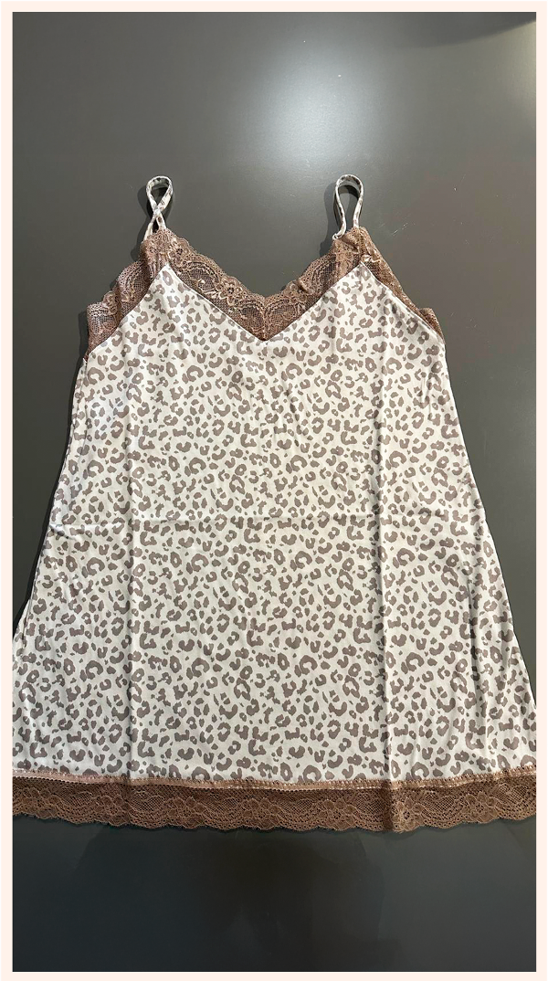Trae breteles regulables y detalle de puntilla beige oscuro en escote, espalda y ruedo.