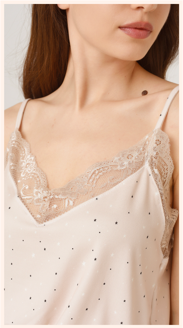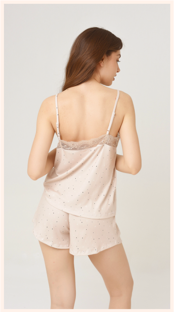 EL PIJAMA ESTRELLITAS es un conjunto de top y short de modal beige, estampado con estrellas de diferentes colores.