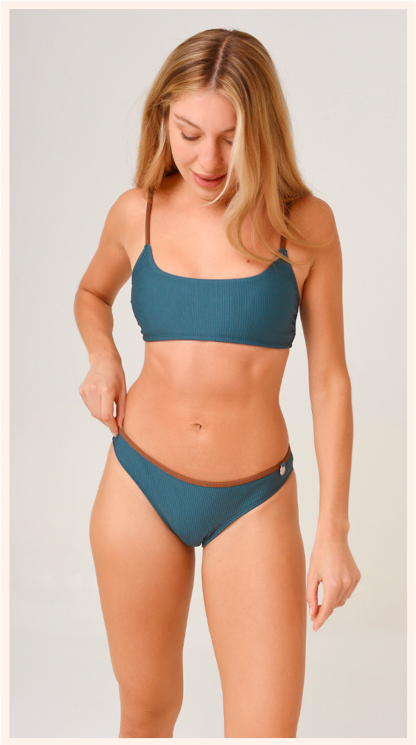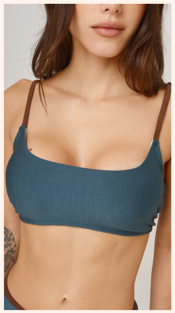 Compuesta por un top de escote recto, con tiras regulables a contratono y almohadillas desmontables. Y bombacha disponible en 2 formatos para que elijas la que más te guste: colaless con tiras de atar o vedetina entera con envivado superior.